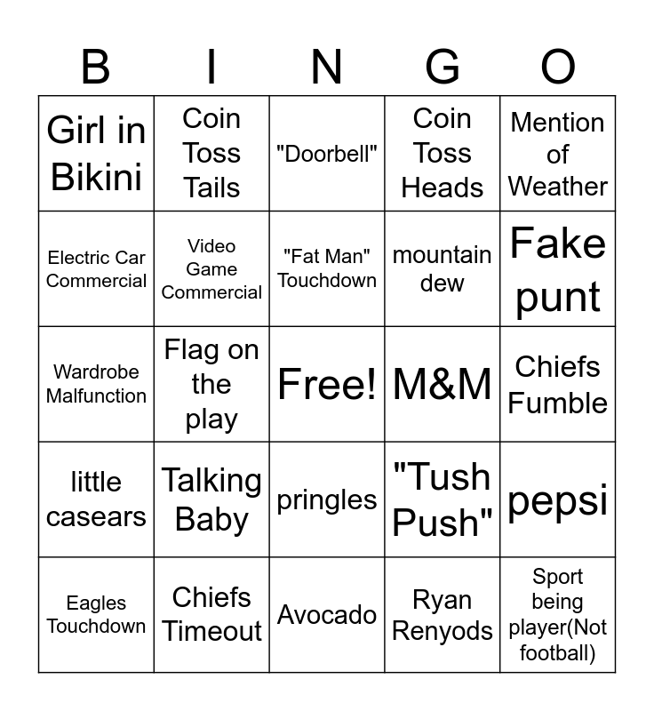 This bingo card has a free space and 74 words: Sideline Takedown(Not Player), Alien, "Doorbell", American Flag, Team Fight, Movie or TV Show Preview, Missed Field Goal, Chiefs Touchdown, Eagles Touchdown, Fast Food Commercial, Superhero in Commercial, End zone Dance, "Fat Man" Touchdown, Electric Car Commercial, "play Under Review", Flag on the play, 4th down Conversion, Fake punt, "Accent", Wardrobe Malfunction, Video Game Commercial, Coin Toss Tails, Coin Toss Heads, Local Commercial, Sport being player(Not football), "Talk to your Doctor", "Alexa", Foreign Car Commercial, American Car Commercial, Disney Character, Mention of Weather, Celeb in Crowd, NFL Players not playing in game, Reference to movie older than 2005, Mardi Gras, Ryan Renyods, Clydesdale, Puppy, Monkey, "Arial Coverage provided by", Avocado, Chiefs Timeout, Eagles Timeout, Tied Score(not 0-0), Reference to Previous Injury, Girl in Bikini, Talking Animal, Talking Baby, Beer Commercial, Challenge Play Called, Coach Covering His Mouth, Interception, Chiefs Fumble, Eagles Fumble, Snoop Dogg, 3-peat, pringles, Taylor Swift singing, coke, pepsi, mountain dew, Gieco, little casears, doritos, M&M, bose, tacobell, Female rapper, "Tush Push", Robot, AI generated, AT&T, Explosion (not fireworks) and Player crying.