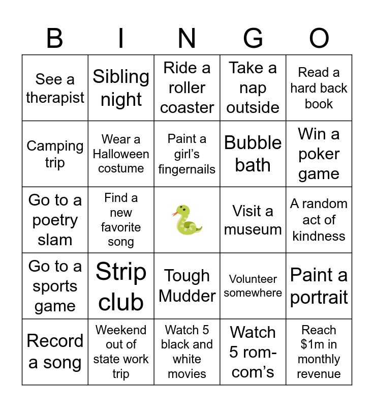 This bingo card has a free space and 24 words: Strip club, Weekend out of state work trip, Paint a girl’s fingernails, Record a song, Read a hard back book, See a therapist, Camping trip, Sibling night, Visit a museum, Tough Mudder, Bubble bath, Go to a poetry slam, Volunteer somewhere, Paint a portrait, Wear a Halloween costume, Watch 5 rom-com’s, A random act of kindness, Ride a roller coaster, Win a poker game, Find a new favorite song, Reach $1m in monthly revenue, Go to a sports game, Take a nap outside and Watch 5 black and white movies.