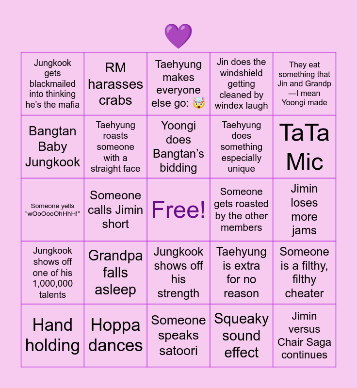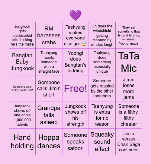 This bingo card has 2 images, a free space and 42 words: God of Destruction strikes again, Jimin versus Chair Saga continues, They play rock, paper, scissors, Hand holding, The same scene is played three times, Squeaky sound effect, Taehyung makes everyone else go: 🤯, Jin blows a kiss, They eat something that Jin and Grandp—I mean Yoongi made, Hoppa dances, Jin does the windshield getting cleaned by windex laugh, Someone gets roasted by the other members, Jungkook shows off his strength, Grandpa falls asleep, Jin gets angry and raps Cypher Pt: 5, Someone speaks satoori, Worldwide Handsome (or whatever), Someone yells “wOoOooOhHhH!”, BigHit editors call Jungkook a baby, TaTa Mic, RM harasses crabs, Maknae Line swarm Hoppa, Bangtan get bias wrecked by each other, Jungkook gets blackmailed into thinking he’s the mafia, Jungkook takes a game way too seriously, Jimin loses more jams, BT21 gets abused by their parents, Taehyung is extra for no reason, Jungkook shows off one of his 1,000,000 talents, TaeTae language is spoken and nobody knows what was said besides Yoongi, Someone is a filthy, filthy cheater, RM’s peace and quiet is shattered, Hoppa is Jin and Yoongi’s little helper, Someone calls Jimin short, Jin and Yoongi watch their out of control kids be chaotic, Jin and Jungkook bicker endlessly, Yoongi does Bangtan’s bidding, Bangtan Baby Jungkook, Taehyung does something especially unique, Jungkook does something to Yoongi and Yoongi doesn’t say nor do anything about it, Taehyung roasts someone with a straight face and Jungkook’s man crush on RM shows itself.