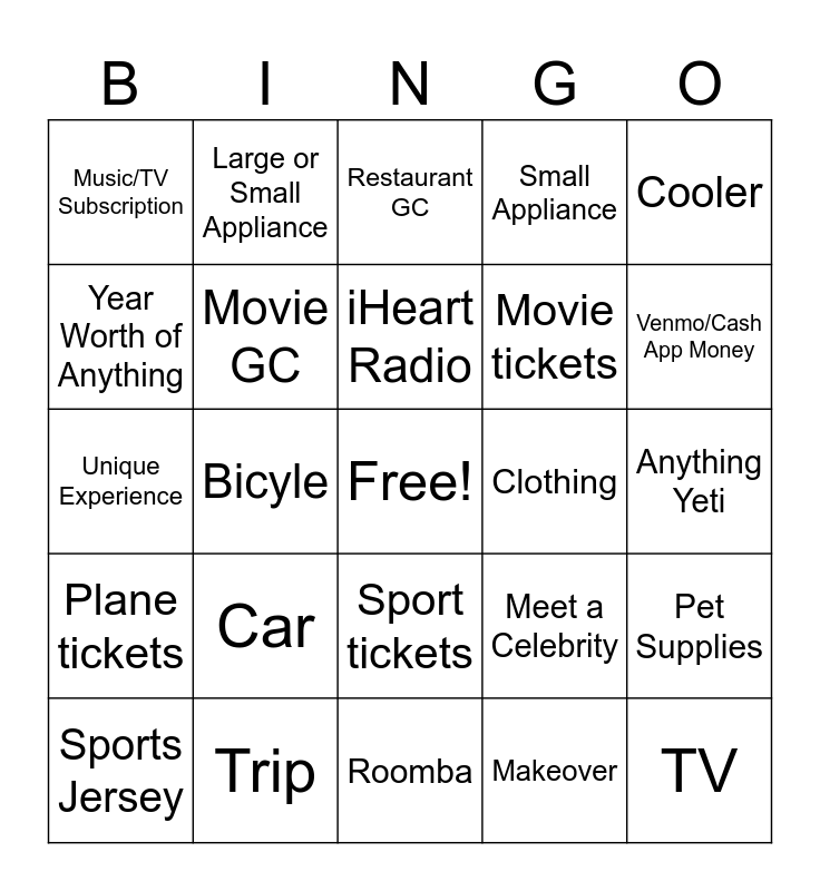 This bingo card has a free space and 24 words: Car, Trip, iHeart Radio, Sports Jersey, Cooler, Music/TV Subscription, Year Worth of Anything, Large or Small Appliance, Clothing, Sport tickets, Movie tickets, Unique Experience, Meet a Celebrity, Pet Supplies, Movie GC, Makeover, Anything Yeti, Restaurant GC, Venmo/Cash App Money, Bicyle, TV, Plane tickets, Small Appliance and Roomba.