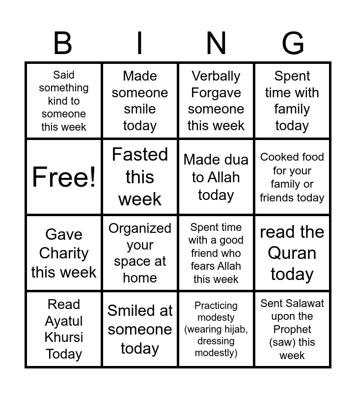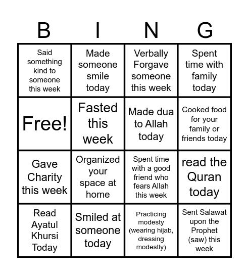 This bingo card has 16 words: Smiled at someone today, read the Quran today, Verbally Forgave someone this week, Said something kind to someone this week, Gave Charity this week, Made someone smile today, Spent time with a good friend who fears Allah this week, Practicing modesty (wearing hijab, dressing modestly), Free!, Fasted this week, Read Ayatul Khursi Today, Spent time with family today, Organized your space at home, Cooked food for your family or friends today, Made dua to Allah today and Sent Salawat upon the Prophet (saw) this week.