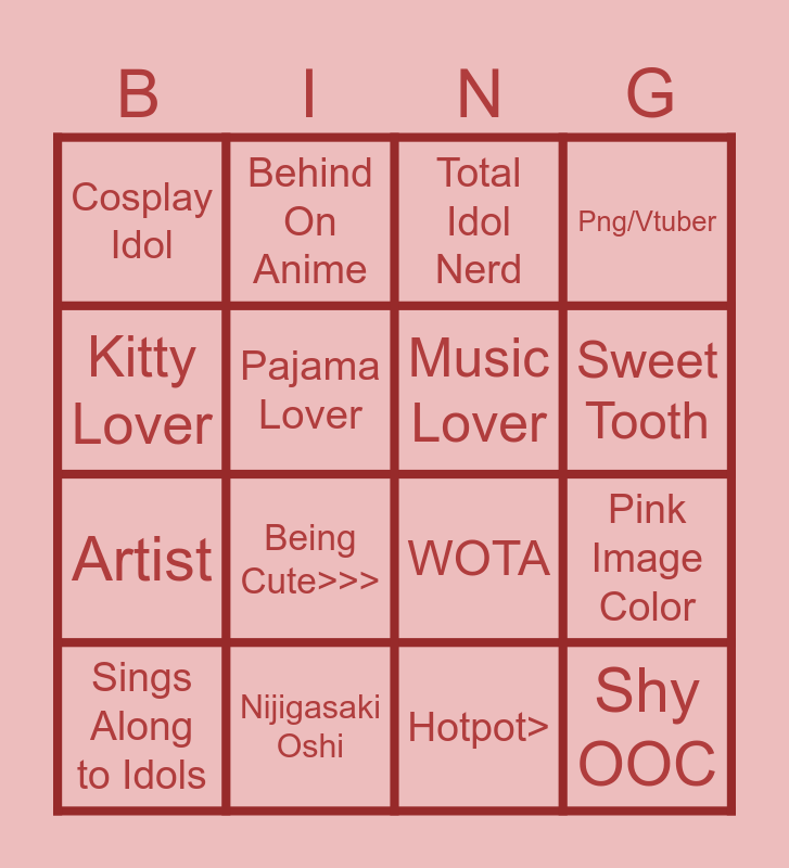 This bingo card has 16 words: Nijigasaki Oshi, Pink Image Color, Total Idol Nerd, Cosplay Idol, Artist, Behind On Anime, WOTA, Hotpot>, Kitty Lover, Pajama Lover, Sings Along to Idols, Png/Vtuber, Being Cute>>>, Sweet Tooth, Music Lover and Shy OOC.