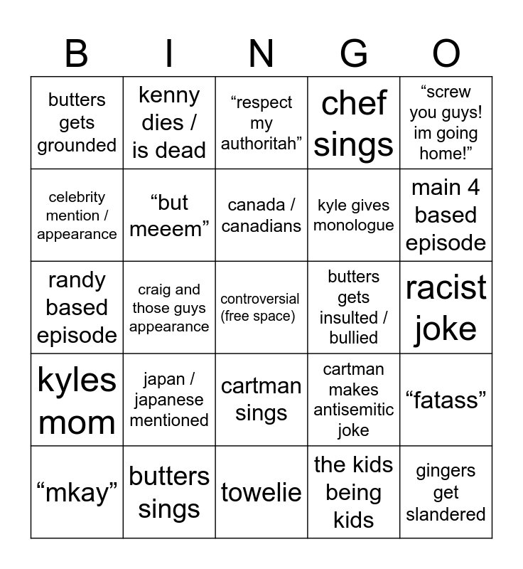 This bingo card has a free space and 24 words: japan / japanese mentioned, butters sings, canada / canadians, “mkay”, “screw you guys! im going home!”, butters gets grounded, celebrity mention / appearance, kenny dies / is dead, butters gets insulted / bullied, cartman sings, kyle gives monologue, randy based episode, cartman makes antisemitic joke, “fatass”, “but meeem”, the kids being kids, racist joke, “respect my authoritah”, main 4 based episode, craig and those guys appearance, gingers get slandered, kyles mom, chef sings and towelie.