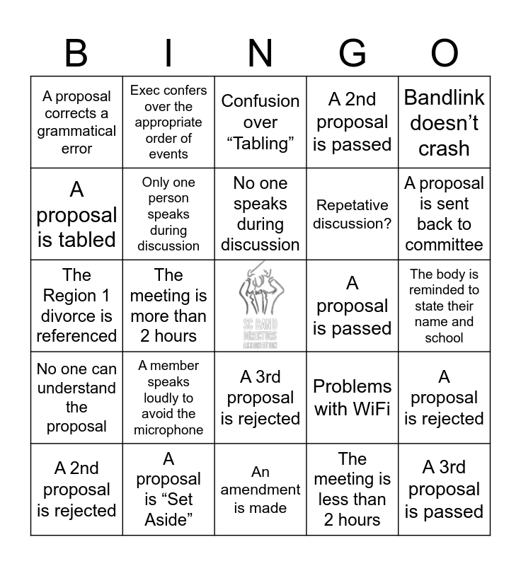 This bingo card has a free space and 27 words: Problems with WiFi, Bandlink crashes AND bandlink doesn’t crash, Repetative discussion?, An amendment is made, A proposal is tabled, Confusion over “Tabling”, Exec confers over the appropriate order of events, No one can understand the proposal, A proposal is passed, A proposal is rejected, The Region 1 divorce is referenced, A 2nd proposal is passed, A 2nd proposal is rejected, A proposal is “Set Aside”, A proposal is sent back to committee, A motion is “Out of Order”, Only one person speaks during discussion, No one speaks during discussion, A member speaks loudly to avoid the microphone, A proposal corrects a grammatical error, The body is reminded to state their name and school, The meeting is less than 2 hours, The meeting is more than 2 hours, A 3rd proposal is passed, A 3rd proposal is rejected, Bandlink doesn’t crash and Someone call “Point of Order”.