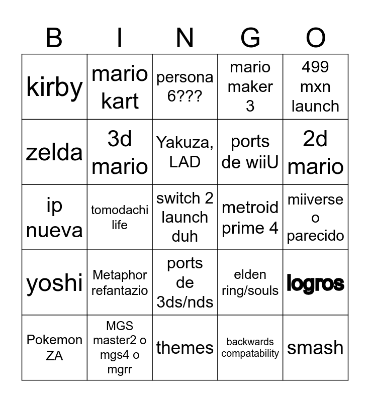 This bingo card has a free space and 24 words: Metaphor refantazio, MGS master2 o mgs4 o mgrr, Yakuza, LAD, Pokemon ZA, 499 mxn launch, kirby, zelda, mario kart, metroid prime 4, ports de 3ds/nds, ports de wiiU, ip nueva, elden ring/souls, logros, 3d mario, backwards compatability, miiverse o parecido, persona 6???, 2d mario, tomodachi life, smash, yoshi, mario maker 3 and themes.