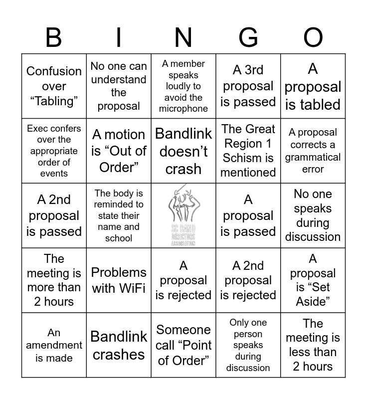 This bingo card has a free space and 24 words: Problems with WiFi, Bandlink crashes, Bandlink doesn’t crash, An amendment is made, A proposal is tabled, Confusion over “Tabling”, Exec confers over the appropriate order of events, No one can understand the proposal, A proposal is passed, A proposal is rejected, The Great Region 1 Schism is mentioned, A 2nd proposal is passed, A 2nd proposal is rejected, A proposal is “Set Aside”, A motion is “Out of Order”, Only one person speaks during discussion, No one speaks during discussion, A member speaks loudly to avoid the microphone, A proposal corrects a grammatical error, The body is reminded to state their name and school, The meeting is less than 2 hours, The meeting is more than 2 hours, A 3rd proposal is passed and Someone call “Point of Order”.