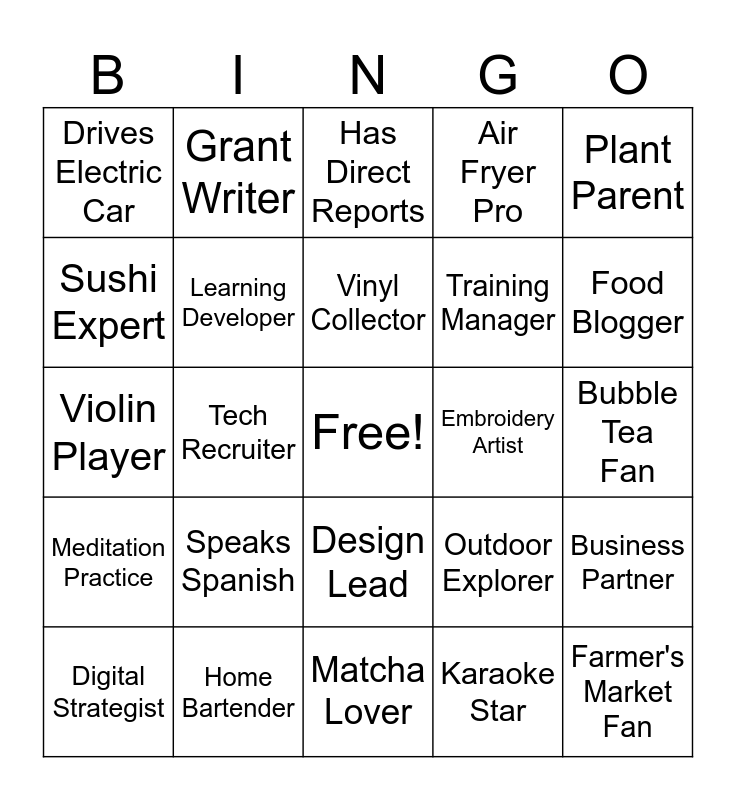 This bingo card has a free space and 105 words: Loves True Crime, Changed Careers, Plant Parent, Remote Worker, Coffee Addict, Manages Team, Netflix Binger, Started in 2023, Pet Parent, Public Speaker, Food Foodie, LinkedIn Expert, Travel Bug, First Conference, Book Worm, Morning Person, Has Direct Reports, Reality TV Fan, Podcast Lover, Mentors Others, Disney Fan, Works Globally, Side Hustler, Gym Regular, Started New Job, Speaks Spanish, Food Blogger, Air Fryer Pro, ERG Leader, TikTok Creator, Outdoor Explorer, Karaoke Star, Meal Prepper, Luxury Shopper, Sneaker Collector, Recent Promotion, Born Out-of-State, Loves Beyonce, Vinyl Collector, Home Bartender, Photographer, Meditation Practice, Hockey Fan, Sushi Expert, DIY Projects, Drives Electric Car, Roller Skater, Farmer's Market Fan, Plays Piano, Astrology Lover, Pickleball Player, Gardener, Pasta Maker, Jazz Enthusiast, Rock Climber, Thrift Shopper, Camper, Journal Lover, Painter, Design Lead, Bubble Tea Fan, Talent Scout, Crypto Investor, Process Engineer, Harry Potter Fan, Safety Manager, CrossFit Athlete, Grant Writer, Violin Player, Tech Recruiter, Matcha Lover, Brand Manager, Data Scientist, Sandwich Artist, Project Lead, Knitting Expert, Content Creator, Cake Decorator, Digital Strategist, Volleyball Player, Culture Champion, Chai Tea Expert, Account Manager, Learning Developer, Program Director, Embroidery Artist, Benefits Pro, 90s Music Fan, Innovation Lead, Origami Expert, Quality Engineer, Swing Dancer, Research Lead, Charcuterie Pro, Business Partner, Succulent Parent, Systems Engineer, Donut Connoisseur, Training Manager, Retro Gamer, Future CEO, Ice Cream Maker, Risk Analyst, Puzzle Master and Creative Director.
