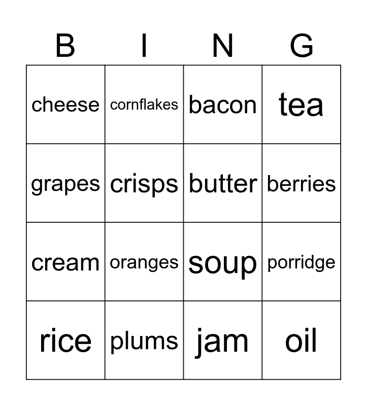 This bingo card has 16 words: plums, porridge, bacon, cheese, cream, cornflakes, soup, jam, grapes, crisps, rice, tea, oranges, berries, butter and oil.