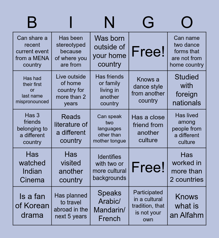 This bingo card has 25 words: Has visited another country, Speaks Arabic/ Mandarin/ French, Has friends or family living in another country, Is a fan of Korean drama, Can name two dance forms that are not from home country, Can share a recent current event from a MENA country, Has had their first or last name mispronounced, Has been stereotyped because of where you are from, Has a close friend from another culture, Identifies with two or more cultural backgrounds, Knows a dance style from another country, Has 3 friends belonging to a different country, Free!, Has worked in more than 2 countries, Live outside of home country for more than 2 years, Knows what is an Alfahm, Has lived among people from a different culture, Was born outside of your home country, Studied with foreign nationals, Reads literature of a different country, Can speak two languages other than mother tongue, Has planned to travel abroad in the next 5 years, Has watched Indian Cinema, Free! and Participated in a cultural tradition, that is not your own.
