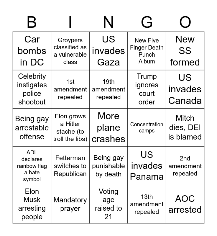 This bingo card has a free space and 24 words: Fetterman switches to Republican, Mandatory prayer, 19th amendment repealed, Elon Musk arresting people, New SS formed, Car bombs in DC, Celebrity instigates police shootout, Groypers classified as a vulnerable class, Concentration camps, Being gay punishable by death, Trump ignores court order, Being gay arrestable offense, US invades Panama, 2nd amendment repealed, 1st amendment repealed, 13th amendment repealed, Mitch dies, DEI is blamed, US invades Gaza, US invades Canada, Elon grows a Hitler stache (to troll the libs), AOC arrested, ADL declares rainbow flag a hate symbol, New Five Finger Death Punch Album and Voting age raised to 21.