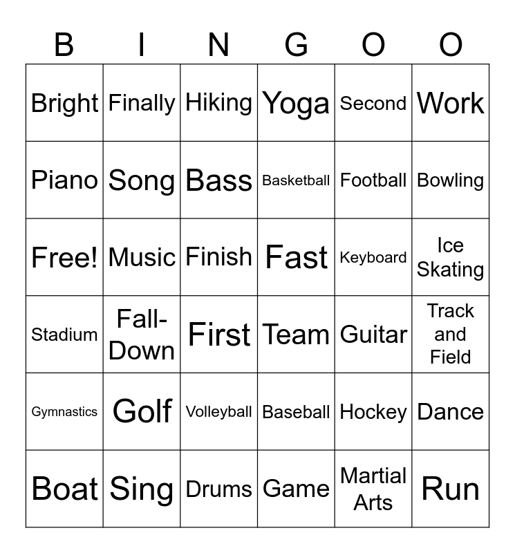 This bingo card has 36 words: Baseball, Volleyball, Game, Piano, Stadium, Fast, Song, Drums, Second, Hockey, Bowling, Yoga, Dance, Music, Basketball, Bright, Gymnastics, Keyboard, Free!, Hiking, Finish, Fall-Down, Team, First, Guitar, Finally, Football, Sing, Bass, Work, Run, Boat, Track and Field, Ice Skating, Golf and Martial Arts.