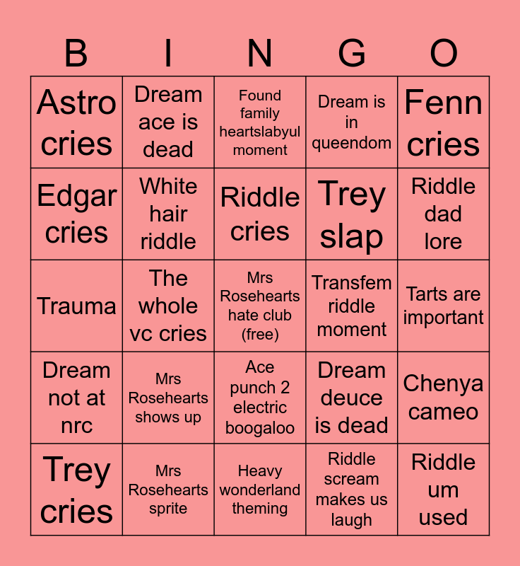 This bingo card has a free space and 24 words: Mrs Rosehearts shows up, Mrs Rosehearts sprite, Riddle cries, Trey cries, Fenn cries, Astro cries, Edgar cries, Dream ace is dead, Transfem riddle moment, Ace punch 2 electric boogaloo, Trey slap, Trauma, Dream deuce is dead, Chenya cameo, White hair riddle, Riddle scream makes us laugh, Tarts are important, Found family heartslabyul moment, Riddle dad lore, The whole vc cries, Riddle um used, Dream not at nrc, Dream is in queendom and Heavy wonderland theming.