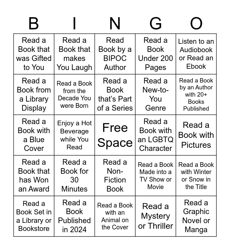 This bingo card has a free space and 24 words: Read a Book for 30 Minutes, Read a Book Published in 2024, Read a Book that’s Part of a Series, Read a Book Set in a Library or Bookstore, Listen to an Audiobook or Read an Ebook, Read a Book that was Gifted to You, Read a Book from a Library Display, Read a Book that makes You Laugh, Read a Book with an LGBTQ Character, Read a Non-Fiction Book, Read a New-to-You Genre, Read a Book with a Blue Cover, Read a Book Made into a TV Show or Movie, Read a Book with Winter or Snow in the Title, Read a Book from the Decade You were Born, Read a Mystery or Thriller, Read a Book with Pictures, Read Book by a BIPOC Author, Read a Book by an Author with 20+ Books Published, Enjoy a Hot Beverage while You Read, Read a Graphic Novel or Manga, Read a Book that has Won an Award, Read a Book Under 200 Pages and Read a Book with an Animal on the Cover.