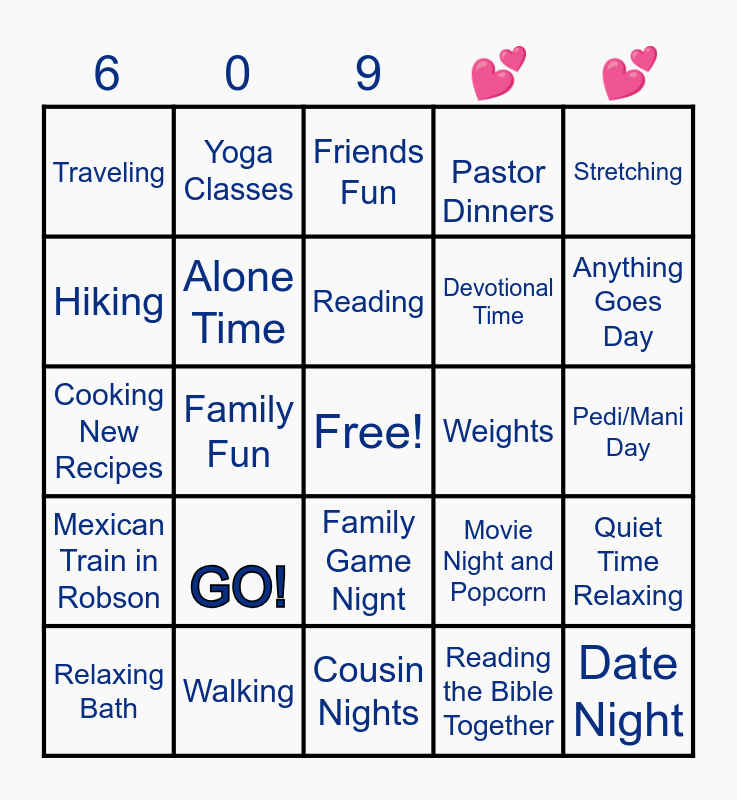 This bingo card has a free space and 24 words: GO!, Walking, Reading, Relaxing Bath, Stretching, Traveling, Hiking, Yoga Classes, Weights, Family Game Nignt, Devotional Time, Cooking New Recipes, Movie Night and Popcorn, Quiet Time Relaxing, Alone Time, Reading the Bible Together, Pedi/Mani Day, Friends Fun, Anything Goes Day, Family Fun, Date Night, Mexican Train in Robson, Pastor Dinners and Cousin Nights.
