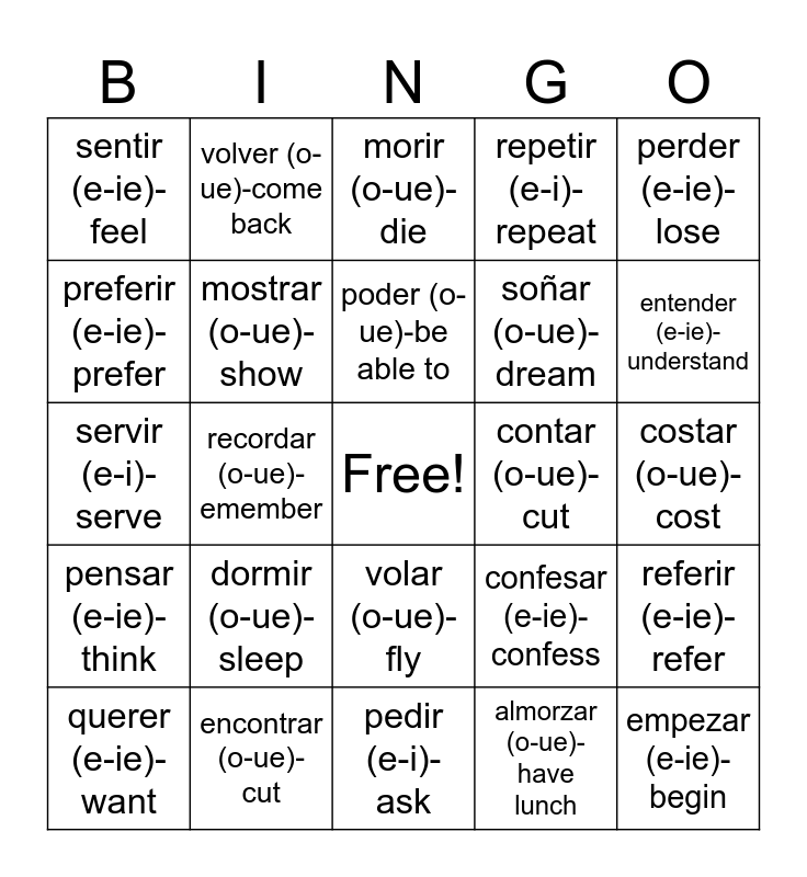 This bingo card has a free space and 29 words: querer (e-ie)-want, comenzar (e-ie)-start, recordar (o-ue)-emember, devolver (o-ue)-return, sentir (e-ie)- feel, morir (o-ue)-die, mostrar (o-ue)-show, dormir (o-ue)-sleep, contar (o-ue)-cut, encontrar (o-ue)-cut, costar (o-ue)-cost, empezar (e-ie)-begin, pedir (e-i)-ask, almorzar (o-ue)-have lunch, entender (e-ie)-understand, defender (e-ie)-defend, volar (o-ue)-fly, pensar (e-ie)-think, perder (e-ie)-lose, servir (e-i)-serve, confesar (e-ie)-confess, resolver (o-ue)-solve, soñar (o-ue)-dream, preferir (e-ie)-prefer, repetir (e-i)-repeat, volver (o-ue)-come back, referir (e-ie)-refer, poder (o-ue)-be able to and cerrar (e-ie)-close.