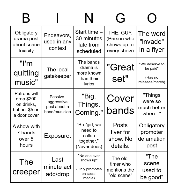 This bingo card has a free space and 24 words: Exposure., Last minute act add/drop, The bands drama is more known than their lyrics, The creeper, The word "invade" in a flyer, Obligatory drama post about scene toxicity, "I'm quitting music", Endeavors, used in any context, Cover bands, "Bro/girl, we need to collab together." (Never does), "Great set", Patrons will drop $200 on drinks, but not $5 on a door cover, Posts flyer for show. No details., Obligatory promoter defamation post, The local gatekeeper, The old-timer who mentions the "old scene", "Things were so much better when...", Start time = 30 minutes late from scheduled, "We deserve to be paid" (Has no releases/merch), Passive-aggressive post about a band/musician, "The scene used to be good", A show with 7 bands over 5 hours, THE. GUY. (Person who shows up to every show) and "No one ever shows up" (Only promotes on social media).