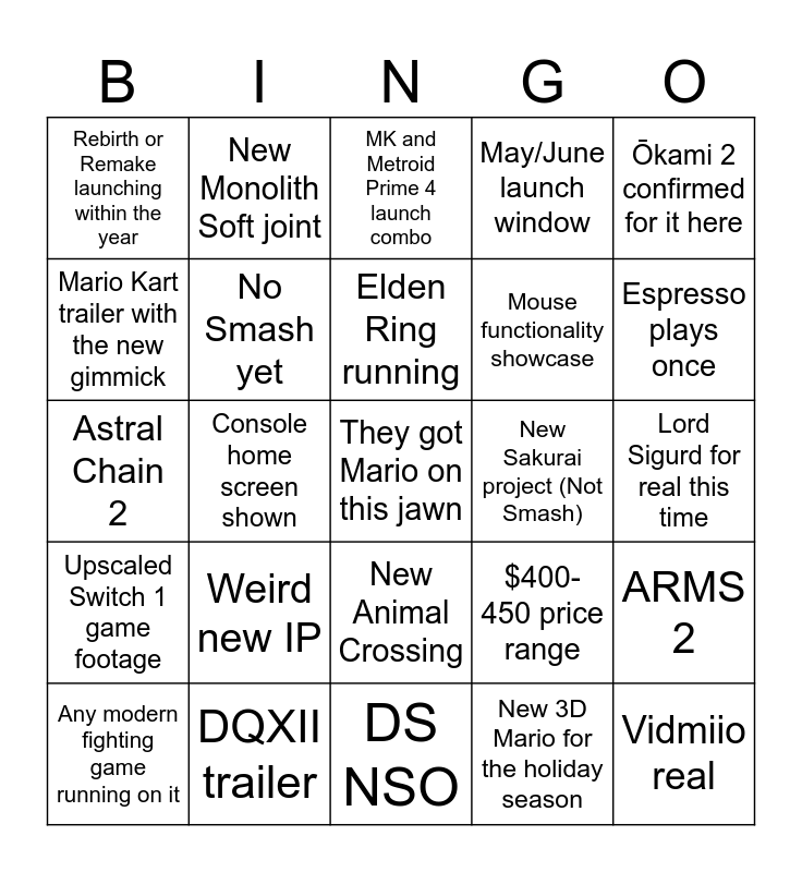 This bingo card has a free space and 24 words: Weird new IP, DQXII trailer, Elden Ring running, Any modern fighting game running on it, Ōkami 2 confirmed for it here, Rebirth or Remake launching within the year, Mario Kart trailer with the new gimmick, New Monolith Soft joint, New Sakurai project (Not Smash), New Animal Crossing, Mouse functionality showcase, Astral Chain 2, $400-450 price range, ARMS 2, No Smash yet, New 3D Mario for the holiday season, Lord Sigurd for real this time, MK and Metroid Prime 4 launch combo, Espresso plays once, Console home screen shown, Vidmiio real, Upscaled Switch 1 game footage, May/June launch window and DS NSO.
