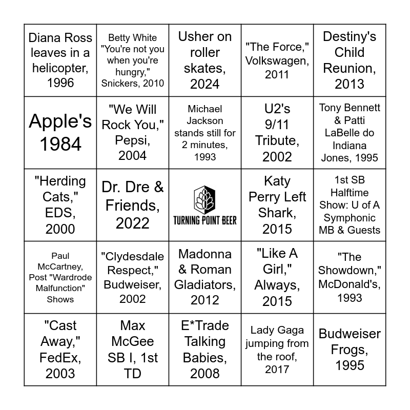 This bingo card has a free space and 50 words: "Hey Kid, Catch!," Coca Cola, 1980, Budweiser Frogs, 1995, "Wassup!," Budweiser, 2000, E*Trade Talking Babies, 2008, "Clydesdale Respect," Budweiser, 2002, Britney Spears & the Joy of Pepsi, 2001, Betty White "You're not you when you're hungry," Snickers, 2010, "The Man Your Man Could Smell Like," Old Spice, 2010, Apple's 1984, "Where's the beef?," Wendy's, 1984, "We Will Rock You," Pepsi, 2004, "The Force," Volkswagen, 2011, "The Showdown," McDonald's, 1993, "Like A Girl," Always, 2015, "Hare Jordan" Nike 1992, Janet Jackson Wardrobe Malfunction, 2004, Michael Jackson stands still for 2 minutes, 1993, Katy Perry Left Shark, 2015, Rhianna's Pregnancy Reveal, 2023, Destiny's Child Reunion, 2013, Dr. Dre & Friends, 2022, Lady Gaga jumping from the roof, 2017, Diana Ross leaves in a helicopter, 1996, U2's 9/11 Tribute, 2002, Prince performing "Purple Rain" in the rain, 2007, Slash duet with Fergie, 2011, Tony Bennett & Patti LaBelle do Indiana Jones, 1995, Shirtless Adam Levine with Maroon 5, 2019, Usher on roller skates, 2024, Madonna & Roman Gladiators, 2012, Walk This Way sung by Aerosmith, Britney, 'NSync, Nelly, Mary J Blige, 2001, David Tyree's Helmet Catch, SB XLII (42), Butler Interception, SB XLIX (49), Julian Edelman Catch, SB LI (51), Max McGee SB I, 1st TD, Steve Young 6 TD Passes, SB XXIX (29), Namath Guarantees SB III Victory (and wins), Elway's Helicopter Dive, SB XXXII (32), First SB Overtime, SB LI (51), 1st SB Halftime Show: U of A Symphonic MB & Guests, "The Extra Point" Budweiser Clydesdales, 1996, "So God Made a Farmer," RAM, 2013, "Puppy Monkey Baby," Mountain Dew, 2016, "Terry Tate: Office Linebacker," Reebok, 2003, "Cast Away," FedEx, 2003, "Herding Cats," EDS, 2000, "Free Doritos," Doritos, 2009, "Alexa Loses Her Voice," Amazon, 2018, Paul McCartney, Post "Wardrode Malfunction" Shows and "NFL 100," NFL, 2019.