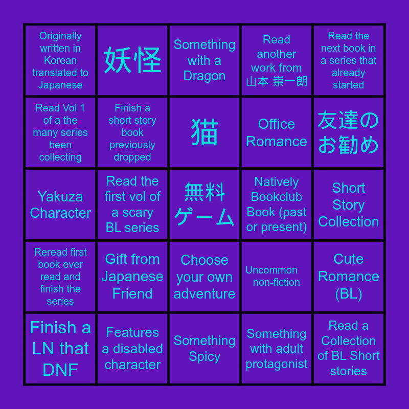 This bingo card has a free space and 24 words: Gift from Japanese Friend, Features a disabled character, 猫, Finish a LN that DNF, Read the next book in a series that already started, Originally written in Korean translated to Japanese, Read Vol 1 of a the many series been collecting, 妖怪, Natively Bookclub Book (past or present), Choose your own adventure, Office Romance, Yakuza Character, Uncommon non-fiction, Cute Romance (BL), Finish a short story book previously dropped, Something with adult protagonist, Short Story Collection, Something with a Dragon, 友達のお勧め, Read the first vol of a scary BL series, Read a Collection of BL Short stories, Reread first book ever read and finish the series, Read another work from 山本 崇一朗 and Something Spicy.