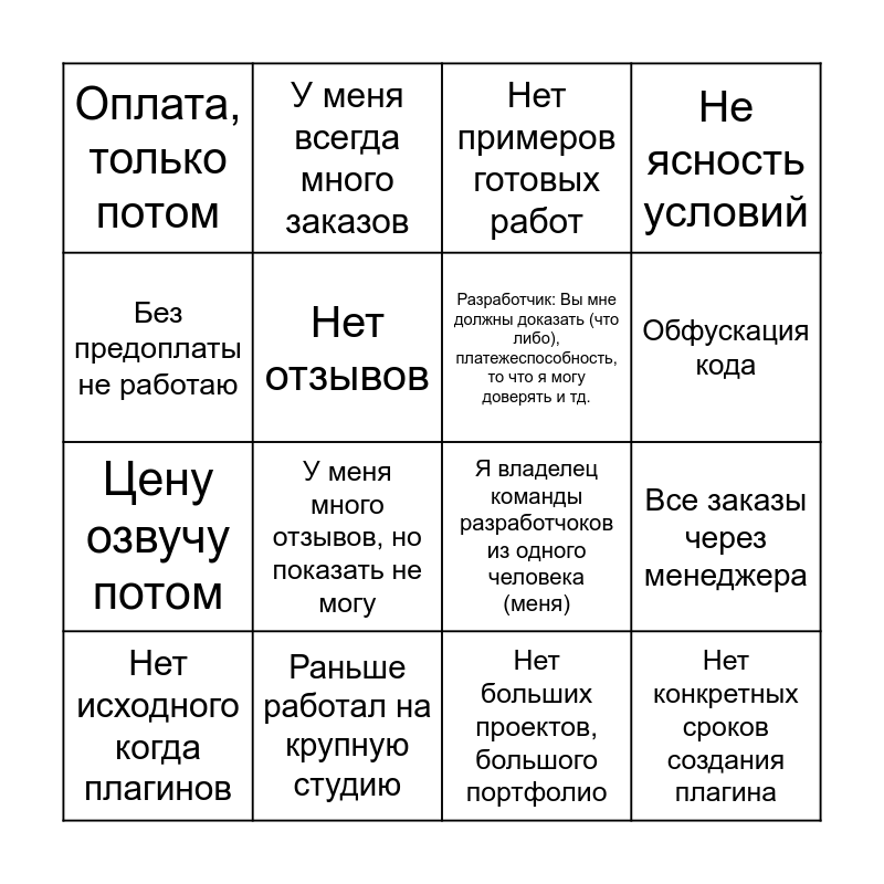 This bingo card has 16 words: Раньше работал на крупную студию, Все заказы через менеджера, Нет примеров готовых работ, Оплата, только потом, Цену озвучу потом, У меня всегда много заказов, Я владелец команды разработчоков из одного человека (меня), Нет больших проектов, большого портфолио, Без предоплаты не работаю, Нет отзывов, Нет исходного когда плагинов, Не ясность условий, У меня много отзывов, но показать не могу, Обфускация кода, Разработчик: Вы мне должны доказать (что либо), платежеспособность, то что я могу доверять и тд. and Нет конкретных сроков создания плагина.