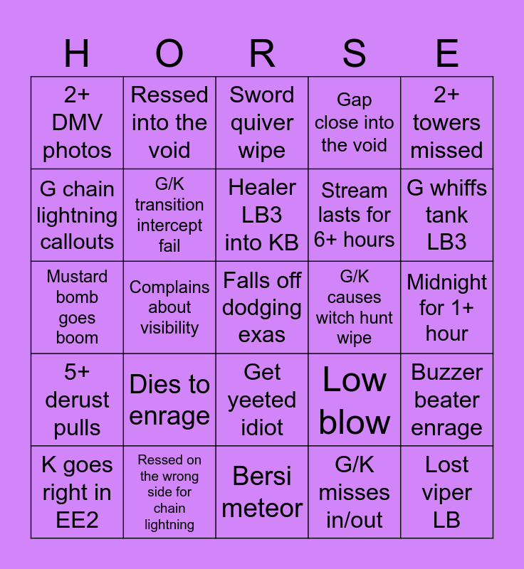 This bingo card has a free space and 34 words: Twilight aoe covers safe spot, G/K misses in/out, Tethers suck, G dies to autos during chain lightning, 5+ derust pulls, G/K transition intercept fail, 2+ towers missed, K goes right in EE2, Ressed into the void, $20+ cringe superchat, Healer LB3 into KB, Sword quiver wipe, Dies to stompies, Midnight mayhem memes, G/K causes witch hunt wipe, G whiffs tank LB3, Ressed on the wrong side for chain lightning, Mustard bomb goes boom, Dies to enrage, Low blow, Get yeeted idiot, Sunrise murder, 2+ DMV photos, Midnight for 1+ hour, Bersi meteor, Lost viper LB, Gap close into the void, Forgets fire/water stock, Stream lasts for 6+ hours, G chain lightning callouts, Jebaited by transition cleave, Complains about visibility, Buzzer beater enrage and Turned around in twilight.