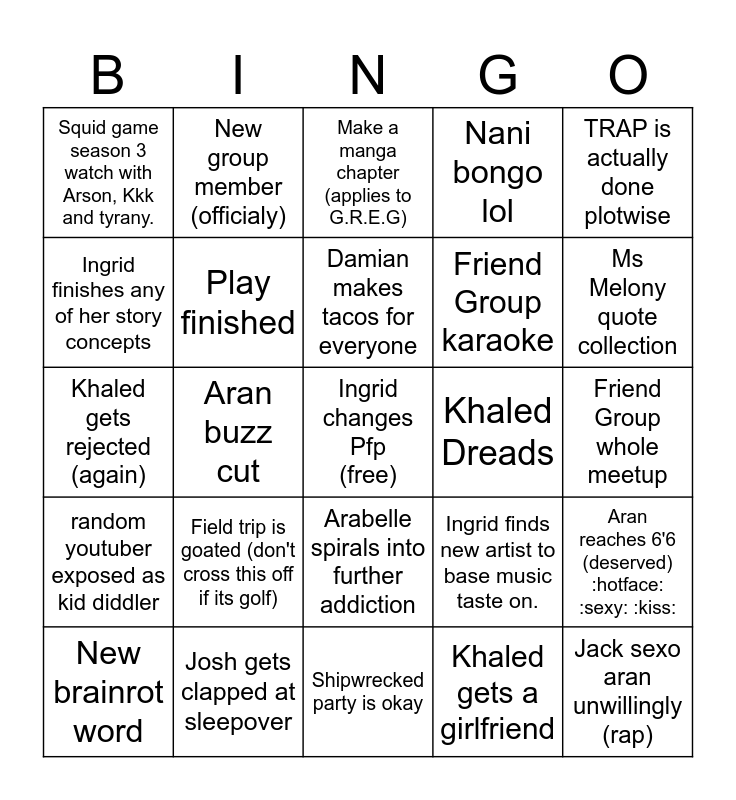 This bingo card has a free space and 24 words: Field trip is goated (don't cross this off if its golf), Josh gets clapped at sleepover, Damian makes tacos for everyone, New brainrot word, TRAP is actually done plotwise, Squid game season 3 watch with Arson, Kkk and tyrany., Ingrid finishes any of her story concepts, New group member (officialy), Khaled Dreads, Arabelle spirals into further addiction, Friend Group karaoke, Khaled gets rejected (again), Ingrid finds new artist to base music taste on., Aran reaches 6'6 (deserved) :hotface: :sexy: :kiss:, Play finished, Khaled gets a girlfriend, Friend Group whole meetup, Make a manga chapter (applies to G.R.E.G), Ms Melony quote collection, Aran buzz cut, Jack sexo aran unwillingly (rap), random youtuber exposed as kid diddler, Nani bongo lol and Shipwrecked party is okay.