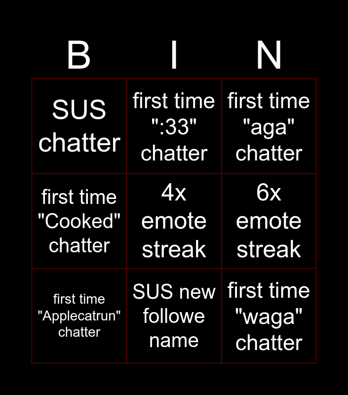 This bingo card has a free space and 8 words: 6x emote streak, first time "aga" chatter, first time ":33" chatter, first time "Applecatrun" chatter, SUS chatter, first time "waga" chatter, first time "Cooked" chatter and SUS new followe name.