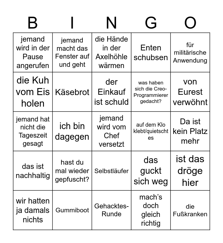 This bingo card has 42 words: Free!, der Einkauf ist schuld, im falschen Papierformat gedruckt, hast du mal wieder gepfuscht?, mach’s doch gleich richtig, ist das dröge hier, jemand wird vom Chef versetzt, ein Kollege wird als Bundeskanzler vorgeschlagen, die Hände in der Axelhöhle wärmen, Selbstläufer, Da ist kein Platz mehr, von Eurest verwöhnt, ich bin dagegen, für militärische Anwendung, Olek & Bolek, das guckt sich weg, als Stubenältester, jemand hat nicht die Tageszeit gesagt, weil es (oliv-) grün ist, jemand macht das Fenster auf und geht, die Kuh vom Eis holen, da war jemand wichtig, die Fußkranken, jemand wird in der Pause angerufen, zum Lippen befeuchten, das kriegen wir nicht ran, was haben sich die Creo-Programmierer gedacht?, Eumel, Kommissar Pentzek, Eintracht-Frankfurt-Hymne, das wird injearbeitet, das ist nachhaltig, Käsebrot, Gehacktes-Runde, jetzt ne (Schwarzwälder-Kirsch-) Torte, wir hatten ja damals nichts, Gummiboot, auf dem Klo klebt/quietscht es, BWL-Justus, Superkonzentrationsmodus, Enten schubsen and historisch gewachsen.
