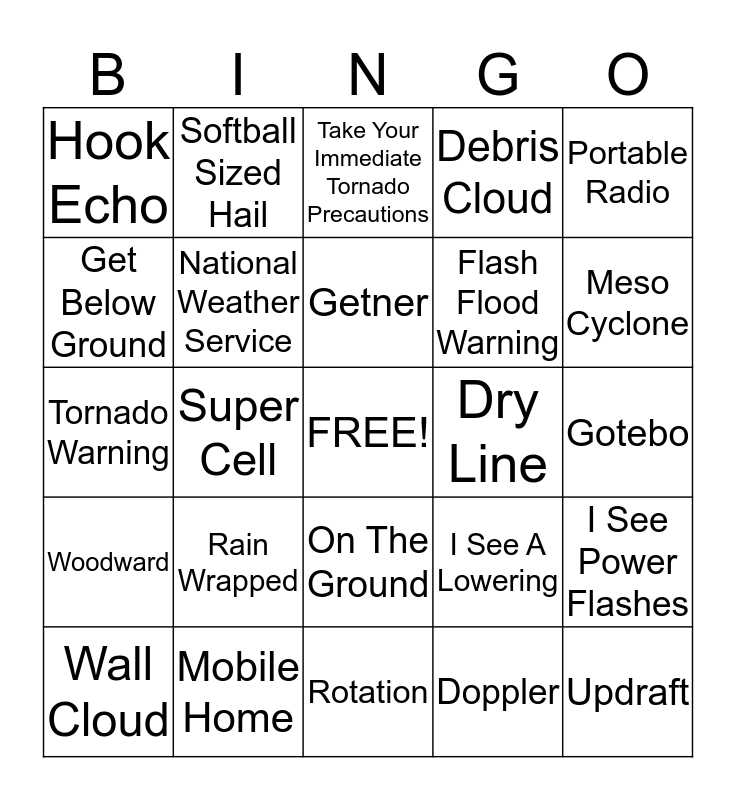 This bingo card has a free space and 24 words: Rain Wrapped, Mobile Home, Getner, Wall Cloud, Portable Radio, Hook Echo, Get Below Ground, Softball Sized Hail, Dry Line, On The Ground, Flash Flood Warning, Tornado Warning, I See A Lowering, I See Power Flashes, National Weather Service, Doppler, Gotebo, Take Your Immediate Tornado Precautions, Meso Cyclone, Super Cell, Updraft, Woodward, Debris Cloud and Rotation.