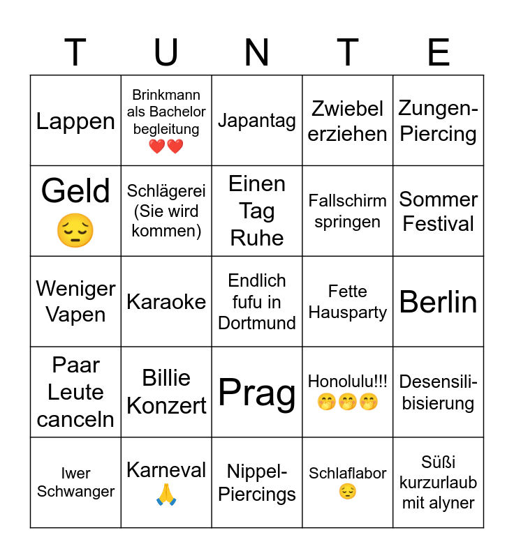 This bingo card has 25 words: Billie Konzert, Nippel-Piercings, Einen Tag Ruhe, Iwer Schwanger, Zungen-Piercing, Lappen, Geld😔, Brinkmann als Bachelor begleitung❤️❤️, Fette Hausparty, Prag, Fallschirm springen, Weniger Vapen, Honolulu!!! 🤭🤭🤭, Desensili-bisierung, Schlägerei (Sie wird kommen), Süßi kurzurlaub mit alyner, Berlin, Japantag, Sommer Festival, Karaoke, Endlich fufu in Dortmund, Karneval🙏, Paar Leute canceln, Zwiebel erziehen and Schlaflabor😔.