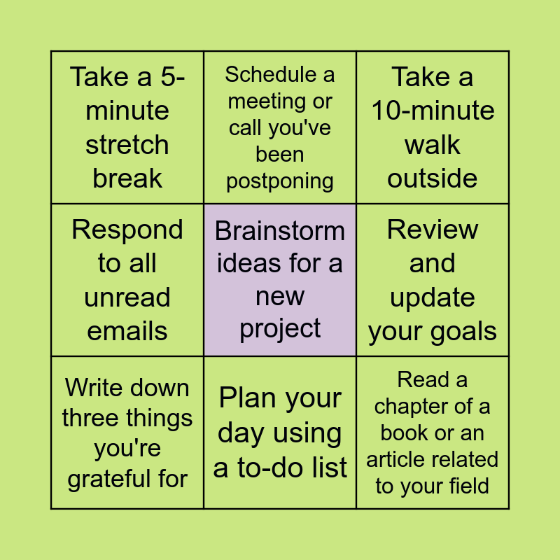 This bingo card has a free space and 11 words: Complete a task in under 10 minutes, Plan your day using a to-do list, Read a chapter of a book or an article related to your field, Write down three things you're grateful for, Schedule a meeting or call you've been postponing, Take a 10-minute walk outside, Review and update your goals, Set a timer and focus on a task for 25 minutes, Respond to all unread emails, Take a 5-minute stretch break and Set a goal for the week and outline steps to achieve it.