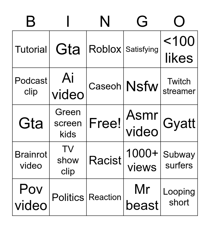 This bingo card has a free space and 24 words: TV show clip, Politics, Caseoh, Pov video, <100 likes, Tutorial, Podcast clip, Gta, Asmr video, Racist, Nsfw, Gta, 1000+ views, Subway surfers, Ai video, Mr beast, Gyatt, Roblox, Twitch streamer, Green screen kids, Looping short, Brainrot video, Satisfying and Reaction.