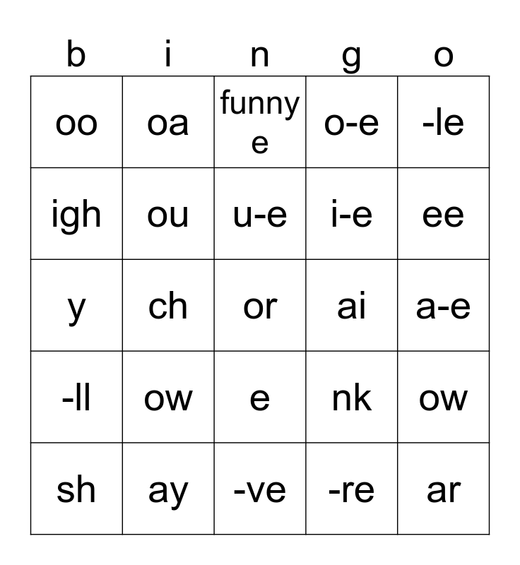 This bingo card has a free space and 29 words: sh, th, ch, ng, oo, funny e, ou, ow, ai, ay, a-e, ar, -ve, -re, ee, ea, e, -ll, -le, y, nk, wh, i-e, igh, o-e, oa, ow, u-e and ew.