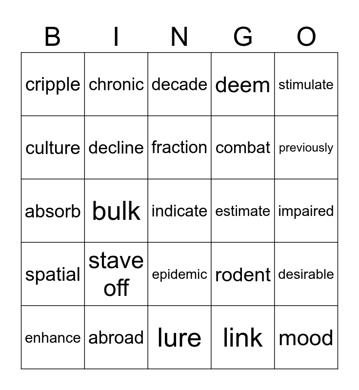 This bingo card has 30 words: abroad, administer, bulk, complex, cripple, decade, decline, epidemic, estimate, lure, impaired, indicate, link, mood, previously, regulate, rodent, spatial, stave off, stimulate, absorb, alleviate, chronic, combat, culture, deem, desirable, enhance, fraction and interval.