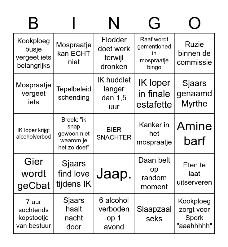 This bingo card has a free space and 24 words: Sjaars find love tijdens IK, Sjaars haalt nacht door, IK huddlet langer dan 1,5 uur, 7 uur sochtends kopstootje van bestuur, Ruzie binnen de commissie, Kookploeg busje vergeet iets belangrijks, Mospraatje vergeet iets, Mospraatje kan ECHT niet, Kanker in het mospraatje, Jaap., IK loper in finale estafette, IK loper krijgt alcoholverbod, Daan belt op random moment, Eten te laat uitserveren, Tepelbeleid schending, Slaapzaal seks, Amine barf, Flodder doet werk terwijl dronken, Sjaars genaamd Myrthe, Broek: "ik snap gewoon niet waarom je het zo doet", Kookploeg zorgt voor Spork "aaahhhhh", Gier wordt geCbat, Raaf wordt gementioned in mospraatje bingo and 6 alcohol verboden op 1 avond.