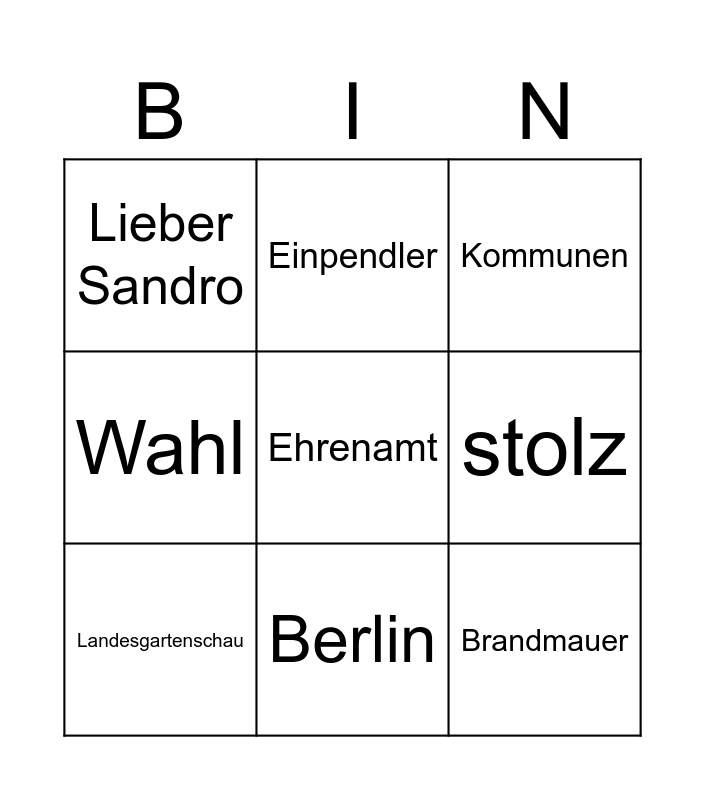 This bingo card has 9 words: Landesgartenschau, Kommunen, Einpendler, Wahl, Lieber Sandro, stolz, Ehrenamt, Brandmauer and Berlin.
