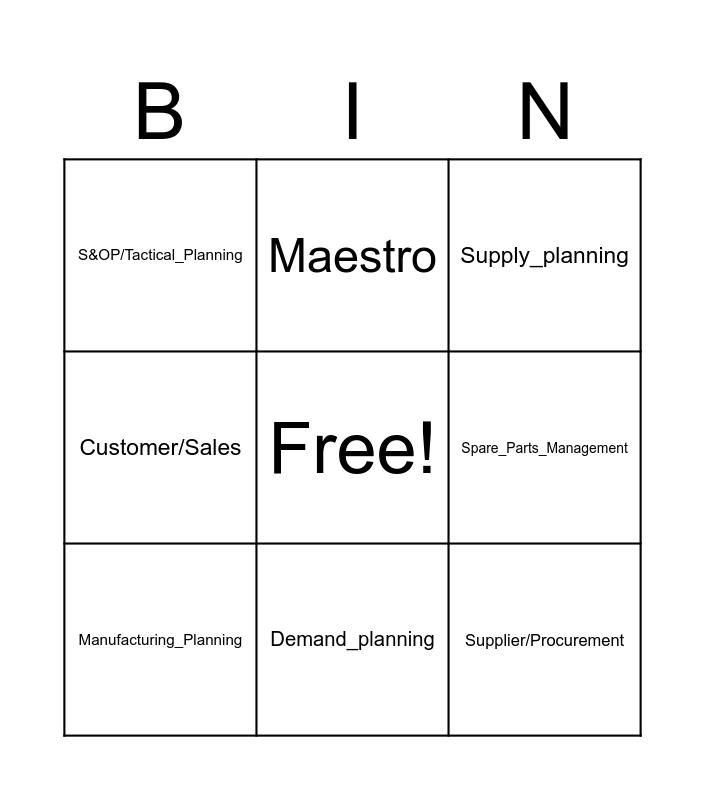 This bingo card has a free space and 10 words: Demand_planning, Supply_planning, S&OP/Tactical_Planning, Supplier/Procurement, Customer/Sales, Manufacturing_Planning, Maestro, Distribution_Planning, Spare_Parts_Management and NPI.