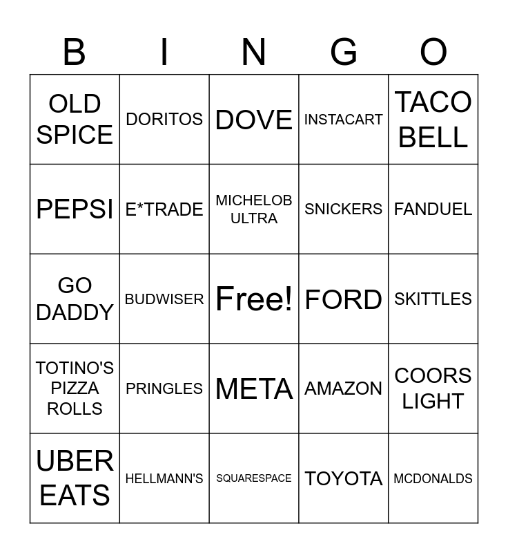 This bingo card has a free space and 24 words: PRINGLES, HELLMANN'S, MICHELOB ULTRA, UBER EATS, TACO BELL, OLD SPICE, PEPSI, DORITOS, FORD, META, SNICKERS, GO DADDY, AMAZON, COORS LIGHT, E*TRADE, TOYOTA, SKITTLES, DOVE, FANDUEL, BUDWISER, MCDONALDS, TOTINO'S PIZZA ROLLS, INSTACART and SQUARESPACE.