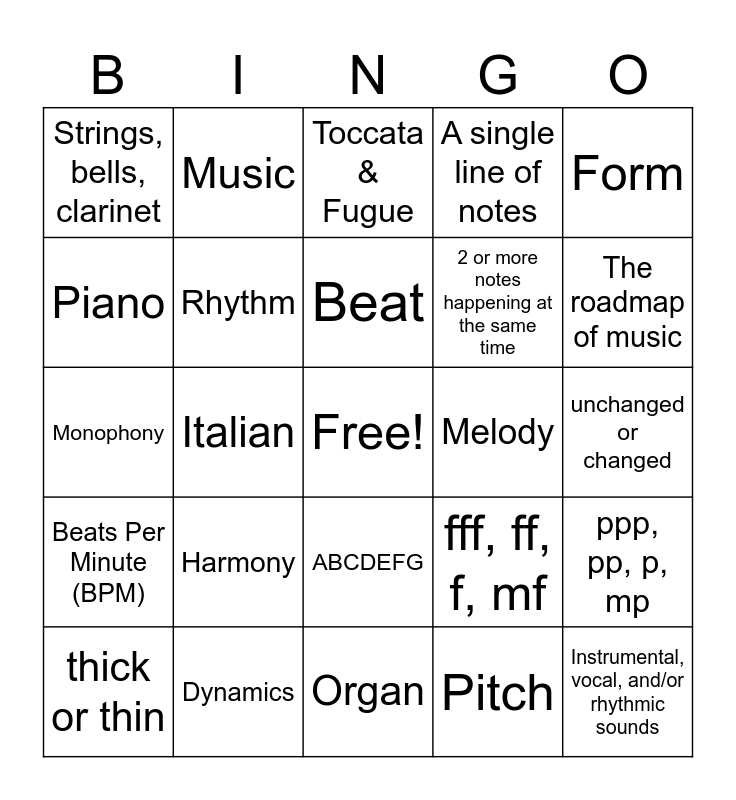 This bingo card has a free space and 32 words: Pitch, Texture, Italian, does not change, Beats Per Minute (BPM), Rhythm, Form, ppp, pp, p, mp, Music, Claire de Lune, Beat, Toccata & Fugue, Dance of the Sugar Plum Fairy, ABC or verse, chorus, bridge, Melody, Polyphony, thick or thin, Monophony, ABCDEFG, Harmony, fff, ff, f, mf, 2/11, unchanged or changed, Dynamics, Instrumental, vocal, and/or rhythmic sounds, A single line of notes, 2 or more notes happening at the same time, Piano, Strings, bells, clarinet, Organ, Slow beat with fast rhythm and The roadmap of music.