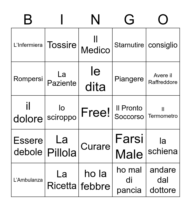 This bingo card has a free space and 29 words: L’Ambulanza, il collo, lo sciroppo, Il Farmicista, L’Infermiera, Il Medico, La Paziente, La Pillola, Il Pronto Soccorso, La Ricetta, Il Termometro, andare dal dottore, ho la febbre, ho mal di pancia, Avere il Raffreddore, riposarsi, Curare, Essere debole, consiglio, il dolore, Farsi Male, Guarire, Piangere, Rompersi, Starnutire, Tossire, la schiena, le dita and il rimedio.