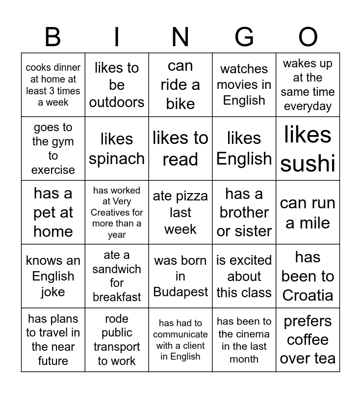 This bingo card has a free space and 24 words: ate a sandwich for breakfast, rode public transport to work, likes to read, has plans to travel in the near future, wakes up at the same time everyday, cooks dinner at home at least 3 times a week, goes to the gym to exercise, likes to be outdoors, has a brother or sister, was born in Budapest, likes English, has a pet at home, is excited about this class, has been to Croatia, likes spinach, has been to the cinema in the last month, can run a mile, can ride a bike, likes sushi, has worked at Very Creatives for more than a year, prefers coffee over tea, knows an English joke, watches movies in English and has had to communicate with a client in English.