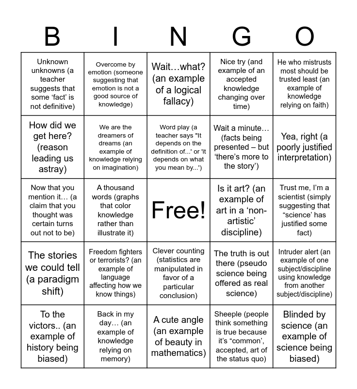 This bingo card has a free space and 36 words: Two roads diverged (conflicting hypotheses in a discipline), In black and white (the textbook is wrong), What makes you think that? (getting your teacher to discuss why they think they know something), We are the dreamers of dreams (an example of knowledge relying on imagination), The truth is out there (pseudo science being offered as real science), The stories we could tell (a paradigm shift), Word play (a teacher says "It depends on the definition of...' or 'it depends on what you mean by...'), Big brother next door (a current and local example of propaganda), He who mistrusts most should be trusted least (an example of knowledge relying on faith), Hey ref – what game are you watching? (different interpretations leading to different theories), A thousand words (graphs that color knowledge rather than illustrate it), Nice try (and example of an accepted knowledge changing over time), Never doubt what nobody is sure about (an example of doubt driving research or knowledge), Is it art? (an example of art in a ‘non-artistic’ discipline), Yea, right (a poorly justified interpretation), Unknown unknowns (a teacher suggests that some ‘fact’ is not definitive), There is no spoon… (an example of the senses leading us away from knowledge), Freedom fighters or terrorists? (an example of language affecting how we know things), Blinded by science (an example of science being biased), Wait…what? (an example of a logical fallacy), Trust me, I’m a scientist (simply suggesting that “science’ has justified some fact), Intruder alert (an example of one subject/discipline using knowledge from another subject/discipline), Back in my day… (an example of knowledge relying on memory), To the victors.. (an example of history being biased), A cute angle (an example of beauty in mathematics), Overcome by emotion (someone suggesting that emotion is not a good source of knowledge), Now that you mention it… (a claim that you thought was certain turns out not to be), Because I said so… (and example of knowledge based on authority), Wait a minute… (facts being presented – but ‘there’s more to the story’), How did we get here? (reason leading us astray), Known unknowns (unanswered questions driving a subject), Twisted tongues (language was used to twist an argument), Sheeple (people think something is true because it’s “common’, accepted, art of the status quo), Clever counting (statistics are manipulated in favor of a particular conclusion), And…? (something that is true but has little relation to reality) and Computer says no (facts unavailable except through technology).
