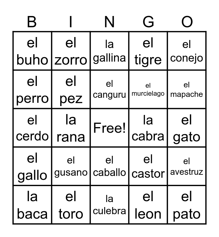 This bingo card has a free space and 24 words: el gusano, el toro, el canguru, la baca, el conejo, el buho, el perro, el zorro, la cabra, el caballo, el murcielago, el cerdo, el castor, el avestruz, el pez, el leon, el gato, la gallina, el mapache, la rana, el pato, el gallo, el tigre and la culebra.