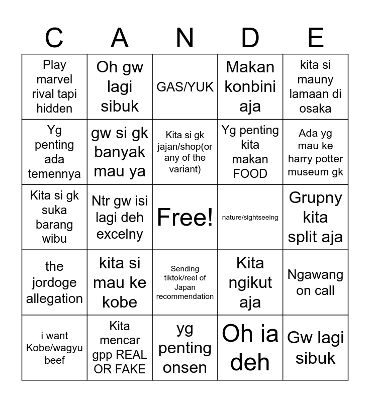 This bingo card has a free space and 24 words: kita si mau ke kobe, Kita mencar gpp REAL OR FAKE, Kita si gk jajan/shop(or any of the variant), i want Kobe/wagyu beef, kita si mauny lamaan di osaka, Play marvel rival tapi hidden, Yg penting ada temennya, Oh gw lagi sibuk, nature/sightseeing, Sending tiktok/reel of Japan recommendation, Yg penting kita makan FOOD, Kita si gk suka barang wibu, Kita ngikut aja, Ngawang on call, gw si gk banyak mau ya, Oh ia deh, Grupny kita split aja, GAS/YUK, Ada yg mau ke harry potter museum gk, Ntr gw isi lagi deh excelny, Gw lagi sibuk, the jordoge allegation, Makan konbini aja and yg penting onsen.