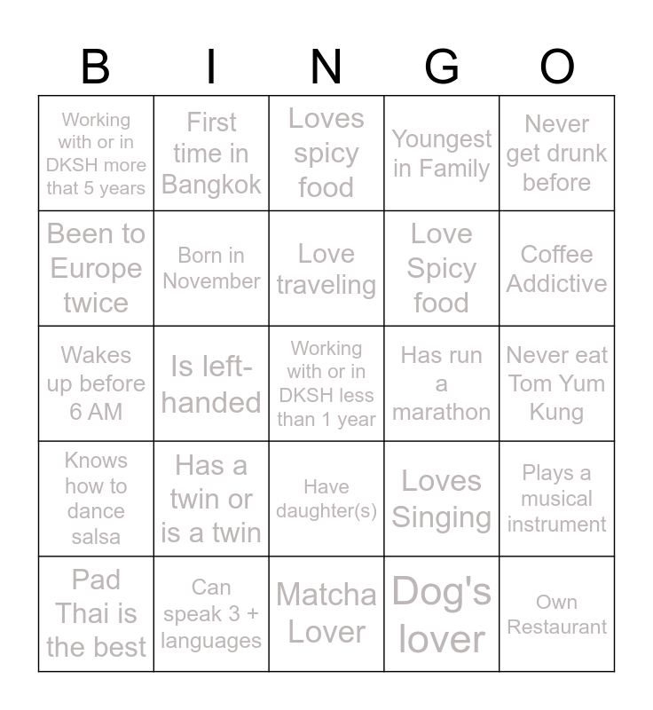 This bingo card has 29 words: Has visited more than 5 countries, Can speak 3 + languages, Loves spicy food, Cat's lover, Never get drunk before, Working with or in DKSH more that 5 years, Born in November, Love traveling, Has run a marathon, Plays a musical instrument, Pad Thai is the best, Is left-handed, Dog's lover, Own Restaurant, Wakes up before 6 AM, Know how to cook, Working with or in DKSH less than 1 year, Loves Singing, Coffee Addictive, Knows how to dance salsa, Has a twin or is a twin, Matcha Lover, Love Spicy food, Never eat Tom Yum Kung, Been to Europe twice, First time in Bangkok, Have daughter(s), Youngest in Family and Is Single.