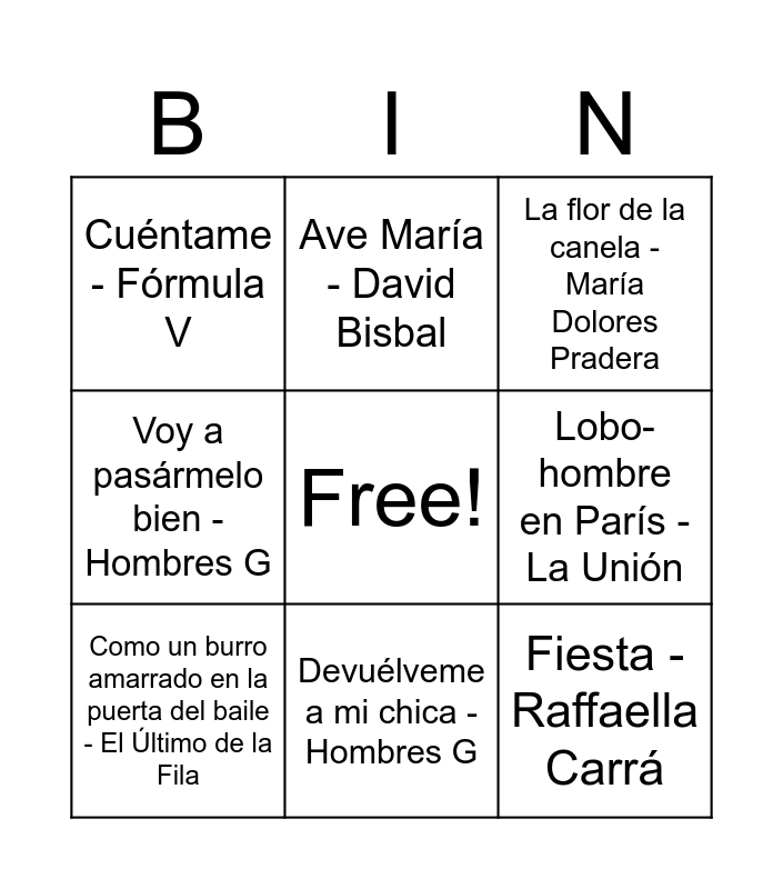 This bingo card has a free space and 9 words: Como un burro amarrado en la puerta del baile - El Último de la Fila, La flor de la canela - María Dolores Pradera, Ave María - David Bisbal, Voy a pasármelo bien - Hombres G, Cuéntame - Fórmula V, Lobo-hombre en París - La Unión, Fiesta - Raffaella Carrá, La escoba - Los Sírex and Devuélveme a mi chica - Hombres G.