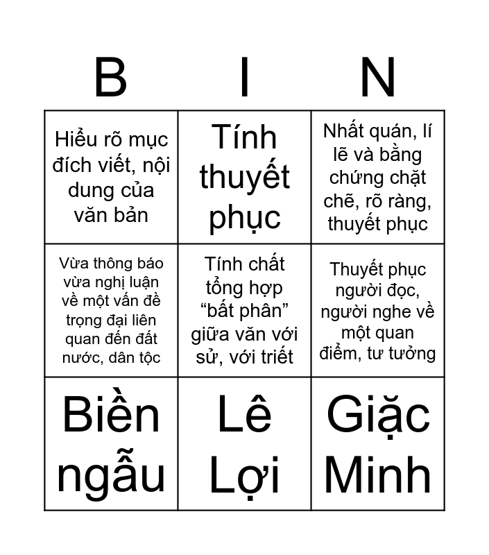 TÌM HIỂU CHUNG VĂN NGHỊ LUẬN VÀ BÌNH NGÔ ĐẠI CÁO | 0w0 | Sec F - Unit 1 | Oc Bingo! | Câu hỏi ôn tập