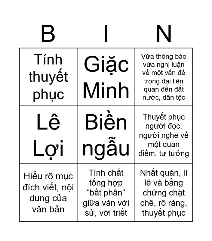 This bingo card has a free space and 8 words: Thuyết phục người đọc, người nghe về một quan điểm, tư tưởng, Vừa thông báo vừa nghị luận về một vấn đề trọng đại liên quan đến đất nước, dân tộc, Giặc Minh, Hiểu rõ mục đích viết, nội dung của văn bản, Tính thuyết phục, Nhất quán, lí lẽ và bằng chứng chặt chẽ, rõ ràng, thuyết phục, Lê Lợi and Tính chất tổng hợp “bất phân” giữa văn với sử, với triết.