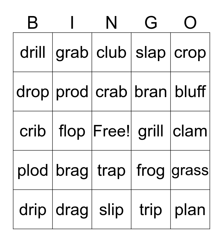 This bingo card has a free space and 24 words: brag, drag, crab, drip, crop, drill, drop, grab, grill, trap, bran, crib, frog, grass, prod, trip, clam, club, bluff, flop, plan, plod, slap and slip.