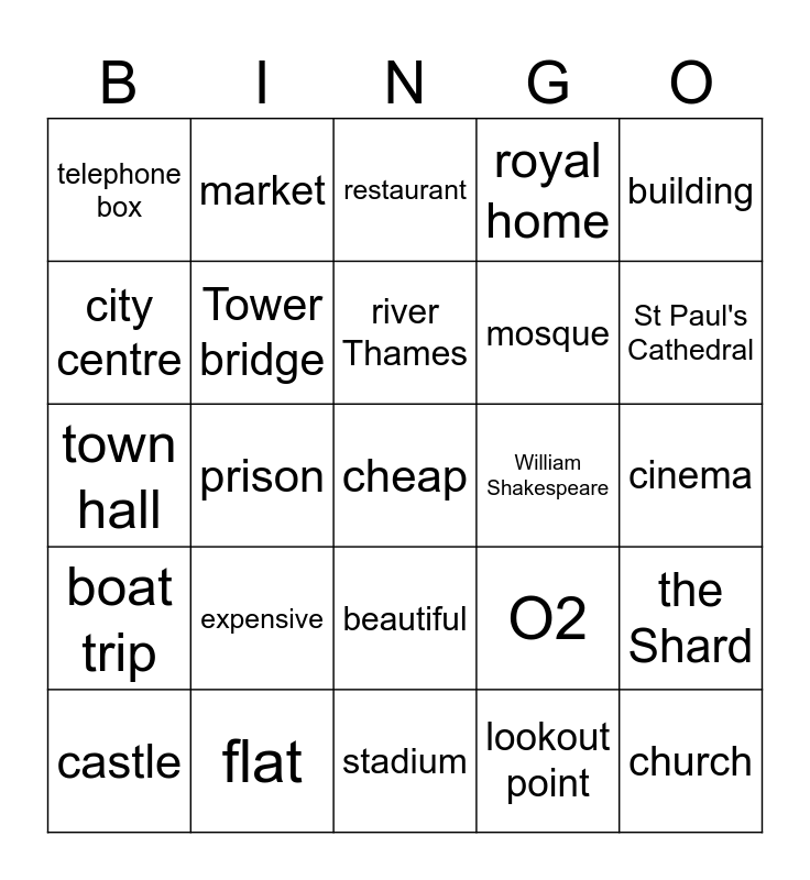This bingo card has 36 words: Free!, Big Ben, clock tower, Tower bridge, O2, boat trip, river Thames, sight, building, the London Eye, prison, royal home, The Globe Theatre, William Shakespeare, St Paul's Cathedral, telephone box, church, expensive, cheap, restaurant, cinema, the Shard, flat, castle, stadium, market, town hall, square, mosque, city centre, lake, monument, lookout point, beautiful, underground and famous.